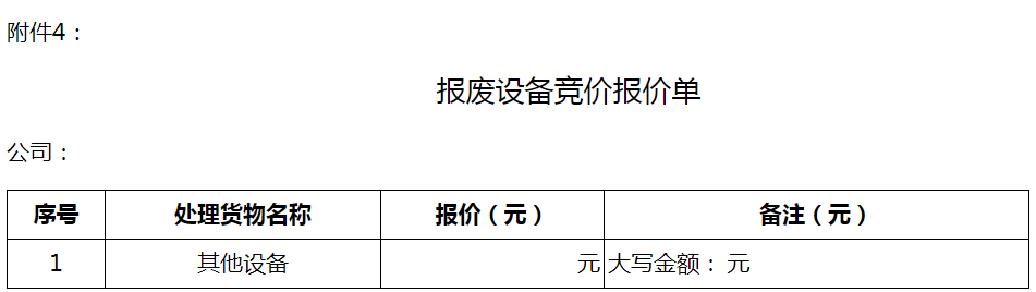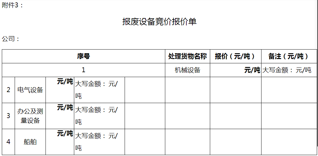 (2)報(bào)價要求:按附件3“報(bào)廢設(shè)備競價報(bào)價單”的機(jī)械設(shè)備、電氣設(shè)備、船舶、辦公及測量設(shè)備等四項(xiàng)內(nèi)容,以及附件4“報(bào)廢設(shè)備競價報(bào)價單”的其他設(shè)備分別填寫第一次報(bào)價,原則上單項(xiàng)最高報(bào)價中標(biāo);若兩個及以上投標(biāo)商在同一競價項(xiàng)目的價格相同且為本次競價的最高報(bào)價,則對該項(xiàng)目重新進(jìn)行現(xiàn)場報(bào)價;若投標(biāo)商愿意以更高價格收購,可進(jìn)行多次現(xiàn)場競價,最終確定最高中標(biāo)價格和中標(biāo)方。